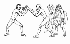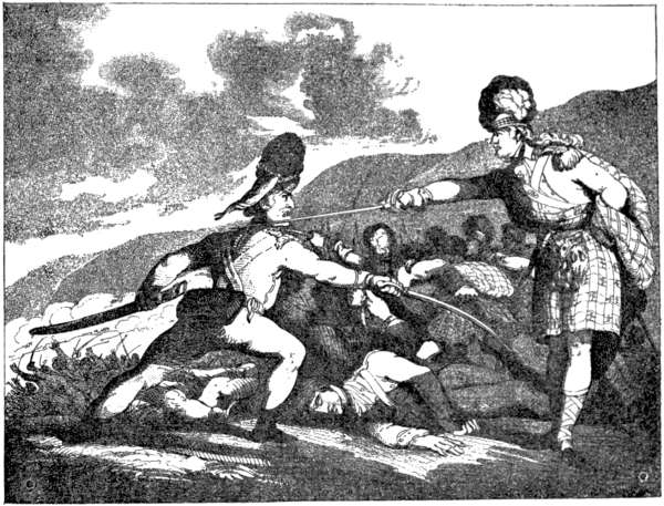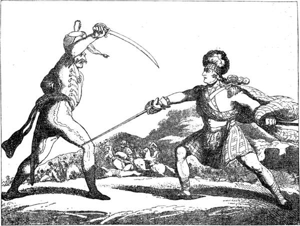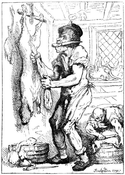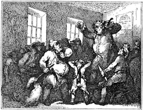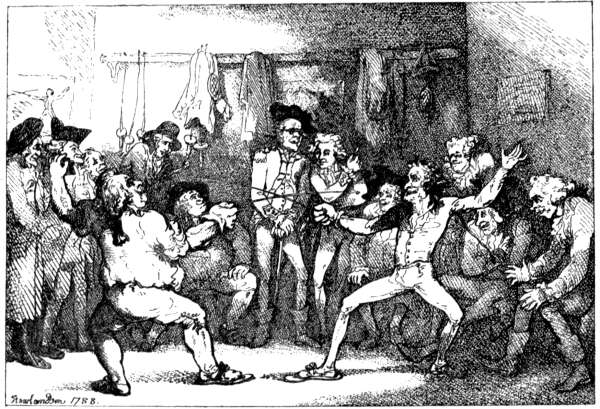 [32] The caricaturist is said to be the hero of the sparring roysterer in his unflattering delineation of A Brace of Blackguards, introducing George Moreland the painter and himself under a situation little complimentary to the softening influences of the fine arts. The plate is given in this work under the date May 30, 1812, when it was re-issued by the artist, but the original etching properly belongs to a much earlier period, and was probably executed about a quarter of a century anterior.