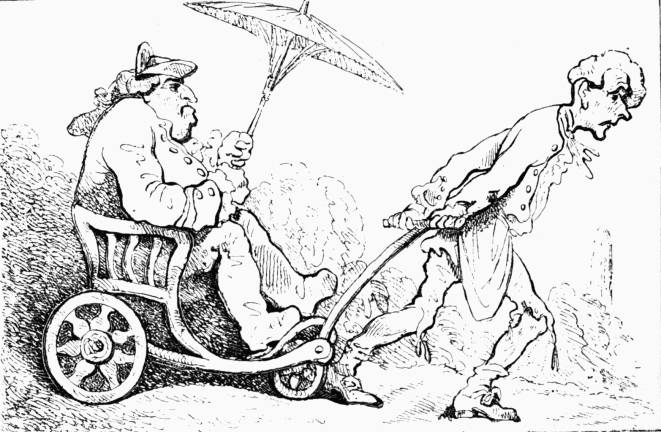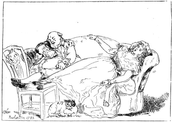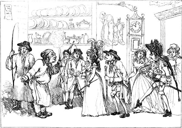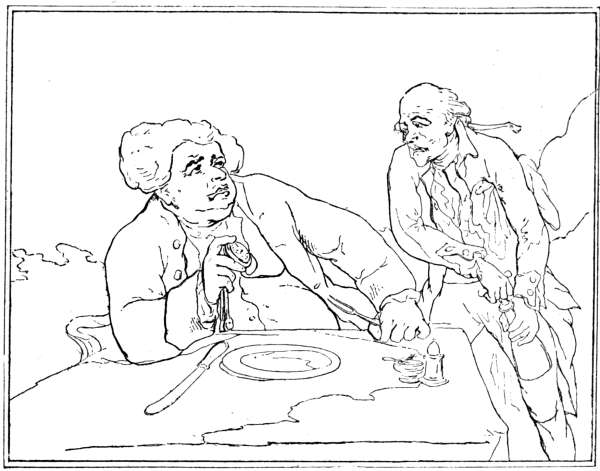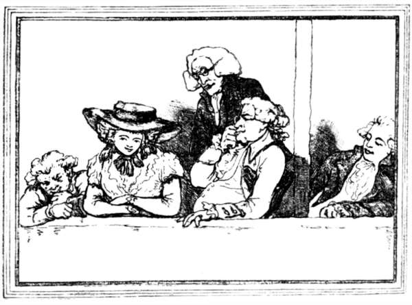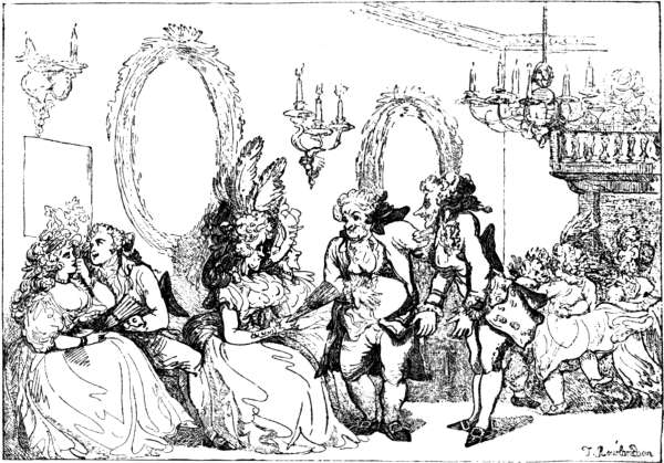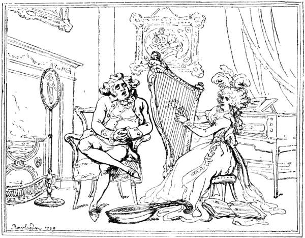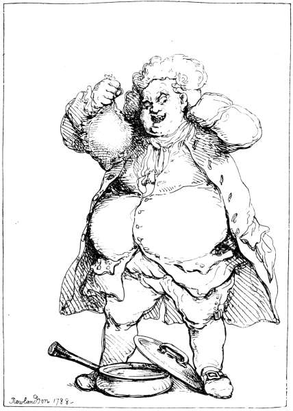The writer, from his gleanings in the same direction, has been able to offer the public a sketch of the 'Life of Henry Bunbury the Caricaturist,' with slighter[4] croquis of his contemporaries. During the interval since the first intention of compiling the present volume as a further contribution to the literature of caricature assumed a definite form, some ten years back, the preparation of the work, imperfect and incomplete as it confessedly must remain—a mere ébauche at best—has been proceeding by slow and toilsome stages, the self-imposed task being rendered a more difficult one than in the instance of James Gillray,[1] from the disheartening circumstance that it is utterly impossible to arrive at anything approaching a comprehensive view of the works of Rowlandson; no adequate collection being in existence, as far as the writer has discovered, with the possible exception of an accumulation in the hands of Mr. Harvey of St. James's Street, the advantages of which gathering (it has been going on steadily for years) have hitherto remained inaccessible to the editor, the possessor's time having been too occupied by the requirements of his other engagements to permit him to arrange the prints as he wishes. This circumstance is to be regretted, since Mr. Harvey admits the personal interest he feels in caricature, upon which, when communicatively inclined, he is able to furnish very valuable information, in part the results of his own wide experience as a purchaser, and still more, perhaps, of painstaking investigations conducted for his private delectation; as his position and opportunities enable him to gratify his tastes in this direction to the fullest extent, it is hinted that on occasions he may feel disposed to furnish the critic with certain valuable facts of a special nature, drawn from the results of his own practical investigations in directions not generally available. This gentleman is, undoubtedly, an authority, and as, it is believed, he possesses unrivalled opportunities for forming a unique collection of prints by any master whose works he may fancy, the writer has, from season to season for the past six years, deferred the completion of his volume on the faith of a generous-sounding promise that he should be allowed to consult Mr. Harvey's collection of prints by Rowlandson, which, according to his knowledge, must be both interesting and valuable, and may possibly contain a great deal that has escaped his previous researches, however zealously they may have been instituted.