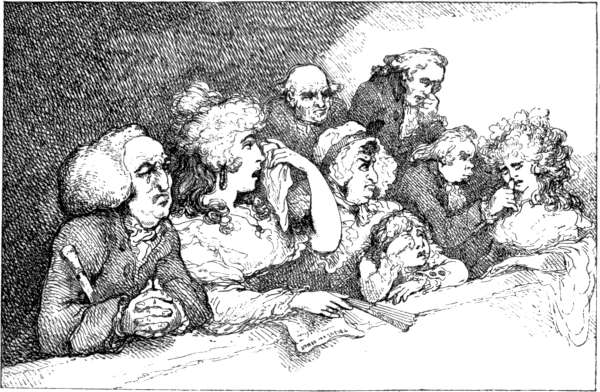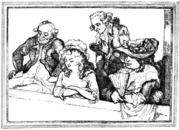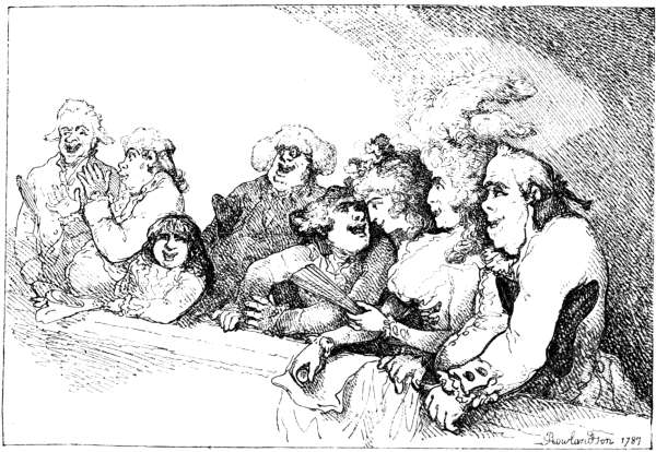 For the space of a century, Rowlandson's caricatures, which are more properly croquis of the life which surrounded him, have continued to afford delight to the appreciators of graphic humour, from the date, 1775, when he sent his first contribution to the Royal Academy. It was only this year (1878) that a pair of his remarkably spirited drawings, Faro Table at Devonshire House, and A Gaming Table, attracted considerable praise and attention on the walls of the Grosvenor Gallery. Although the artist was master of the most[10] elegant refinement, both of delineation and colouring, and produced the most delicious female heads with that lightness and daintiness of touch which was his peculiar gift, bringing all the graces, sparkle and animation of the French school to bear upon the models of winsome female beauty our own favoured isles produced for the exercise of his pencil, we are constrained to admit, thus early in our summary, that too many of his productions are strongly tinctured by that coarseness of subject and sentiment which has been held to disfigure the works of contemporary humorists; his wit, it must be remembered, was of the jocose school of Smollett and Fielding, and in justice it must be taken into consideration that his designs, even in their most uncompromising and grosser aspects, simply reflect the colour of a period which was the reverse of squeamish, and, as has been pertinently observed by the late Thomas Wright, 'of a generation celebrated for anything rather than delicacy.'