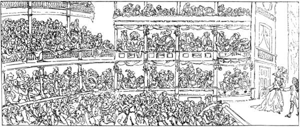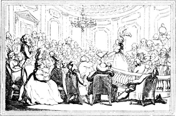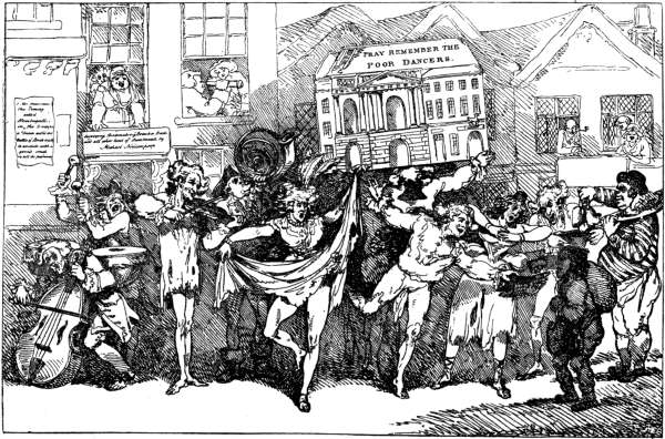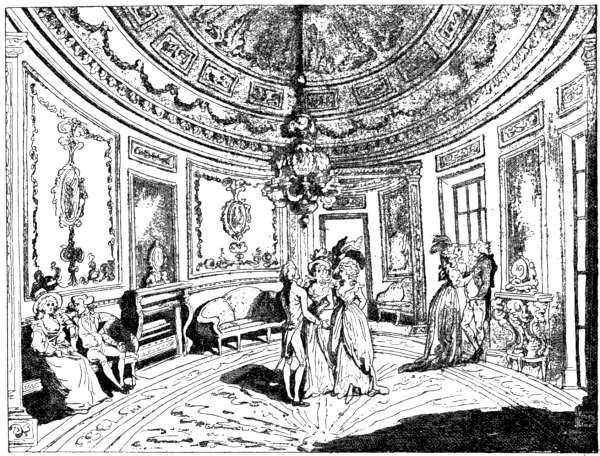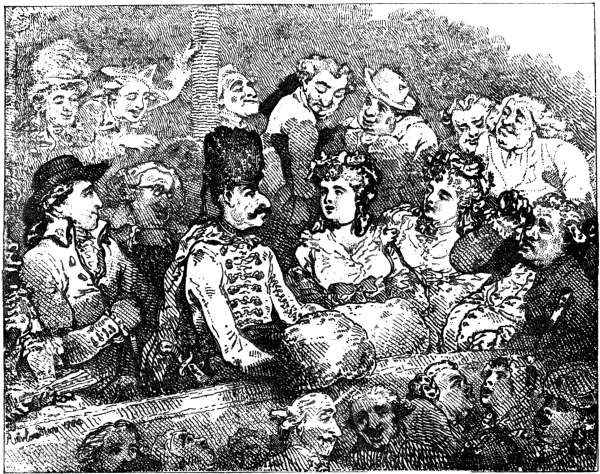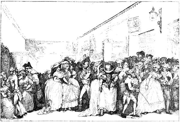Print-sellers' shops, at home and abroad, were ransacked, and auctions of engravings were attended, whenever the alluring word caricatures occurred in the catalogue. The supply was remarkably limited, the demand considerable and increasing; and prices, from the nature of the request, shortly became unreasonable. Choice caricatures, or those in fairly good condition, were pushed up to nearly the prices of the original drawings, and even at these enhanced rates but few examples were forthcoming. In Paris, Brussels, and London, a five-pound note became about a fair equivalent for a moderately fine impression after Rowlandson, if the plate were large and the subject important or curious, while for certain of the more sought-after examples, this rate was doubled; for such plates as Vauxhall Gardens, dealers expect a still larger price—indeed, five-and-twenty pounds have been demanded in many instances. The chances of fresh examples by Rowlandson coming into the market have decreased, and possibly the competition will relax when there is no longer a chance of exciting it.