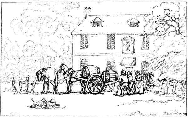 In the unrivalled collection of water-colour drawings of the English school, which are found on the walls of the sumptuous permanent Museum of Art at South Kensington, are exhibited three characteristic examples of Rowlandson's talents in the caricature direction. The Parish Vestry, 1784, a humorous and spirited drawing, belonging to the artist's best time, formed part of the munificent gift made by Mr. William Smith to the nation; as did the second example, entitled Brook Green Fair, which we should assign to about the year 1800. The third drawing, representing The old Elephant and Castle Inn, Newington, is also due to a liberal donor, being the gift of G. W. Atkinson, Esq.