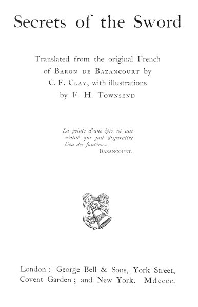 If French is, as we have been told, the natural language of the art of fencing, it seems a particularly rash venture to translate a French book on the subject into English. This is especially the case when the original is such a work as Les Secrets de l’Épée, which so far from being a dry technical manual, that might be sufficiently rendered by a baldly literal version, is one of those fascinating, chatty books, written in a happy vein, in which the manner of writing is the matter of principal importance. But the delightful ease and artful simplicity of style that captivate the reader are the translator’s despair. I have made the attempt for my own amusement, and I am publishing my translation because the original work, which was first published in 1862 and reprinted in 1875, has been for some years inaccessible, and because I think it is a book that will interest English fencers.