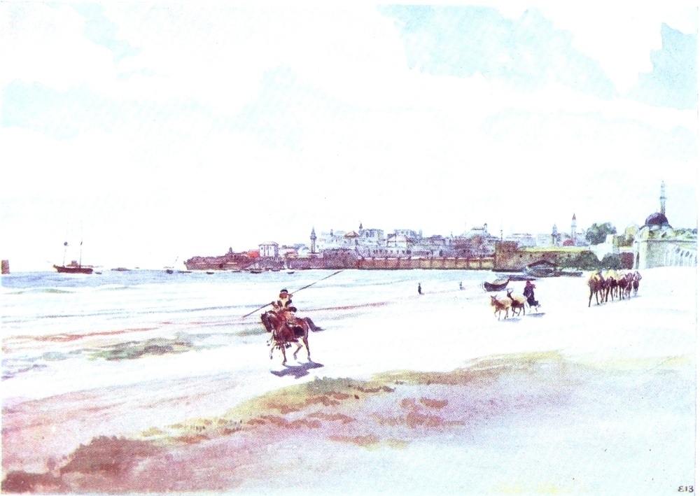 As we drove to the little German inn in the outskirts of the town, we noticed the air getting richer with the scent of orange-flowers, and soon we passed into the region of the orange-orchards. The trees were creamy white with dense blossom, and the ripe fruit was dotted about in the masses of white. The honey they gave us at breakfast was from these orange-flowers. Here our dragoman, Isaac, met us. I made my first sketch—the first, I trust, of a series I marked down before leaving Alexandria. It was of Jaffa, seen over the orange-trees from the inn garden, and charming it was to sit there in the cool shade, with birds singing overhead as never one hears them in Egypt. Fragments of classical pillars stood about and served as seats under the chequered shade of flowering fruit-trees along the garden paths. The Mediterranean appeared to my right, and overhead sailed great pearly clouds in the vibrating blue of the fresh spring sky. I must say I felt very happy at the reality of my presence on the soil of Palestine!