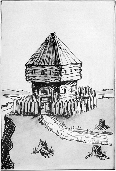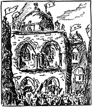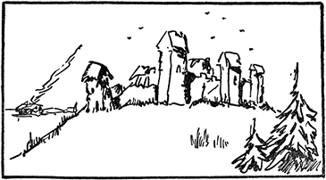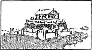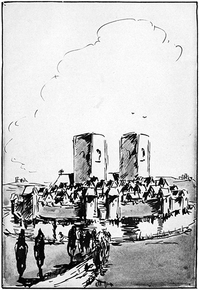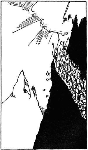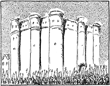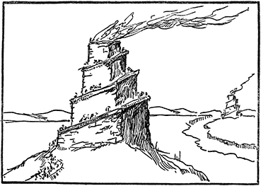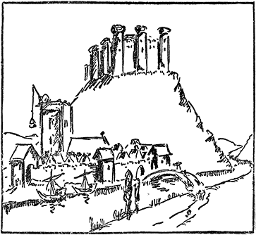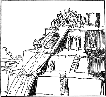 Then darkness once more and other ladders, steeper and even more dangerous than those we had climbed before, and suddenly the fresh air of the wide heavens. We had reached the highest gallery. Above us the sky. Below us the city—a little toy-town, where busy ants were hastily crawling hither and thither, each one intent upon his or her particular business, and beyond the jumble of stones, the wide greenness of the open country.