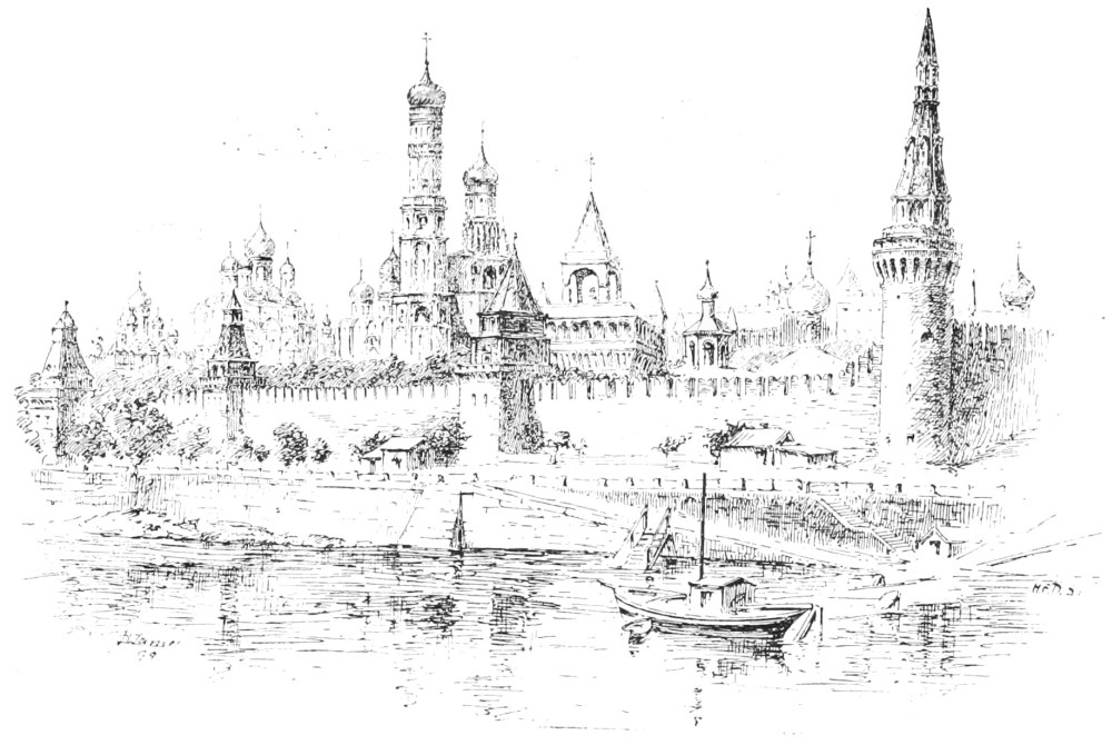 Long ago the tremendous extent of this town, apparently without limit, amazed strangers no less than the richness and multitude of its buildings filled pilgrims with awe and reverence. To the tourist to-day it is as a vision of magnificent splendour and brilliance, for{2} seen in the clear sunlight of a summer day Moscow has beauty and brightness no other city possesses. Long lines of ivory whiteness capped with vivid green or flushed with carmine and ruby; great globes of deepest blue, patches of purple and dashes of aquamarine; many gleaming domes of gold, glowing halos of burnished copper, dazzling points of glistening silver—such make Moscow at sunset like part of a rainbow streaked with lightning and thickly bedizened with great gems.