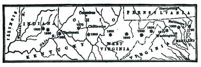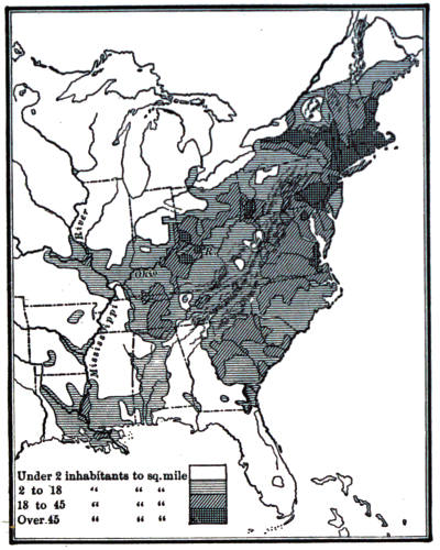 The progress of the Westward Movement in colonial times was slow. A hundred and fifty years passed before the frontier line was pushed beyond the Appalachian ridge. This slowness was due in part to the action of the English government. Soon after England (in 1763) came into possession of the country west of the Alleghanies the king issued a proclamation reserving most of the newly[6] acquired territory for the use of the Indians and forbidding the governors of the colonies to grant lands to white men west of the mountains. If this plan had been carried out, English civilization would have been confined to the seaboard, and the richest and fairest portions of the earth would have been permanently reserved as a hunting-ground for savages and as a lair for wild beasts. But the War of the Revolution took the Western country from England and gave it to the United States. The Ohio valley was then thrown open to settlers, and white men from all parts of the world rushed into the new lands like hungry cattle rushing into new pastures. In twenty years after the acknowledgment of our independence (in 1783) the Frontier Line moved farther westward than it had moved in a century under British rule.