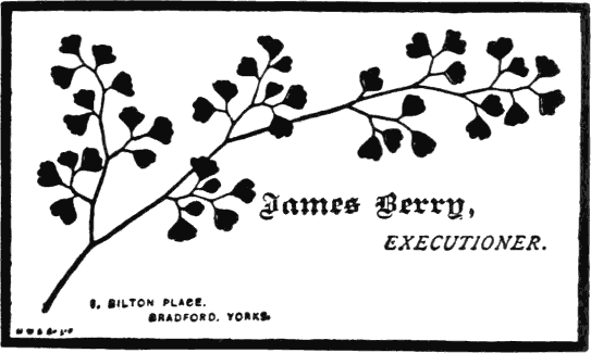 I always try to remain unknown while travelling, but there is a certain class of people who will always crowd round as if an executioner were a peep-show.[Pg 133] On the journey above mentioned, after changing at York, I got into a carriage with a benevolent-looking old gentleman. A little crowd collected round the door, and just as we were starting a porter stuck his head into the window, pointed to my fellow-passenger, and with a silly attempt at jocularity said:—“I hope you’ll give him the right tightener.” The old gentleman seemed much mystified, and of course I was quite unable to imagine what it meant. At Darlington there was another little crowd, which collected for a short time about our carriage. Fortunately none of the people knew me, so that when the old gentleman asked them what was the matter they could only tell him that Berry was travelling by that train and that they wanted to have a look at him. The old gentleman seemed anxious to see such an awful man as the executioner, and asked me if I should know him if I saw him. I pointed out a low-looking character as being possibly the man, and my fellow-traveller said, “Yes! very much like him.” I suppose he had seen a so-called portrait of me in one of the newspapers. We got quite friendly, and when we reached Durham, where I was getting out, he asked for my card. The reader can imagine his surprise when I handed it to him.