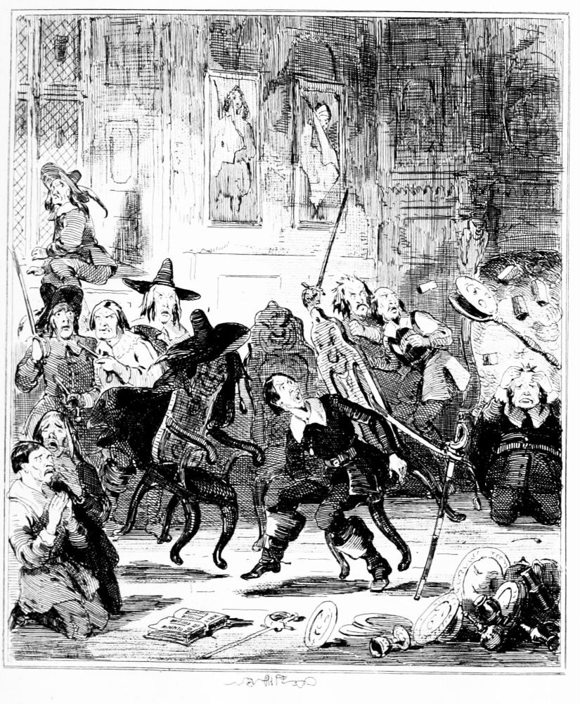 [2] This celebrated painter, whilst decorating the dome of St. Paul’s Cathedral, nearly fell a victim to his zeal in that undertaking. One day, when pursuing his task on the scaffold erected round the dome for that purpose, he kept walking backwards, surveying the effect of his work, until he had nearly approached the edge, from which another step would have precipitated him. At this instant his servant, who perceived the danger his master was in, with a wonderful presence of mind seized a pot of colour, and threw it over the painting. This caused Sir James to rush forward for the preservation of his work, and he was thus saved from being dashed to pieces, which, but for this timely intervention, must have been his fate. This eminent man painted the whole of the cupola of St. Paul’s, and also the halls of Greenwich Hospital and Blenheim. He was born in 1675, and was originally a house-painter, but afterwards applied himself to historical subjects, and equalled the best painters of his time. In 1719 he was appointed Historical Painter to George I., and shortly afterwards was created a knight. He was employed in several extensive works, for which he was in general very inadequately paid; and, at times, even found it difficult to obtain the stipulated price. His demands were contested at Greenwich Hospital, although he only received 25s. a square yard; about the same time a foreigner, for doing less work at Montague House, received 2000l. for his work, besides 600l. for his diet. For St. Paul’s he received 40s. a square yard. He also decorated More Park, but was obliged to sue Mr. Styles for it; he, however, not only recovered 3,500l. the sum agreed to be paid him, but 500l. more for decorations about the house. Notwithstanding these difficulties, he acquired a considerable fortune, and was several years in parliament; he was also a Fellow of the Royal Society. His genius was equally happy in history, allegory, landscape, and architecture; he even practised the last science as a man of business, and built several houses. He died in 1734, in the same place where he was born. He left a son, who followed his father’s profession; and a daughter, who married the celebrated Hogarth.