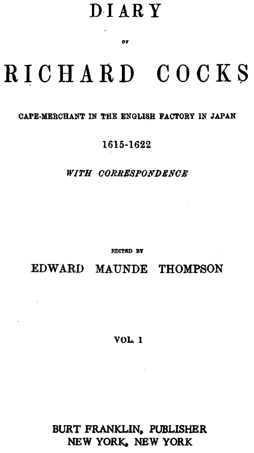 Purchas, in his Pilgrimes,[1] has told us the story of the first landing of the English and its causes. The present volumes give us the internal history of the factory. The original diary of Richard Cocks, the chief factor, once formed part of those papers of the East India Company, whose luckless fate it was to be destroyed or cast out of their home in Leadenhall-street to wander through the world. Happily the diary escaped many perils, and now rests in the British Museum, where, bound in two volumes, it bears the numbers, Additional MSS. 31,300, 31,301. Unfortunately it is not complete. It runs from 1st June, 1615, to 14th January, 1619, and from 5th December, 1620, to 24th March, 1622; but it has lost nothing since it left the Company’s archives.[2] [iii] I have not thought it necessary to print the whole of it; but only those entries which have absolutely no interest, e.g. bare memoranda of sales and purchases, have been omitted. As a supplement, to illustrate the diary and to fill in the periods which are wanting therein, I have added in an Appendix a selection from the letters of Cocks and others, chiefly from the archives of the India Office.
