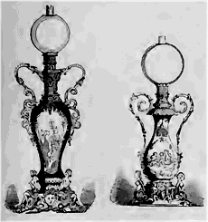 Depuis que le système dont Carcel est l'inventeur est tombé dans le domaine public, un grand nombre de fabricants ont envoyé à l'exposition des lampes mécaniques dont les dispositions sont plus ou moins ingénieuses et les détails plus ou moins bien soignés. Il nous semble que maintenant ce qu'il faut atteindre, c'est le bon marché, et sous ce point de vue il y a encore de grands progrès à faire, et ensuite l'élégance des formes. Nous citerons, parmi ceux dont nous avons remarqué les produits, M. Joanne, M. Dehennault et M. Silvant. Nous retrouverons tout à l'heure M. Joanne dans une invention qui lui est propre. M. Dehennault est le premier qui ait eu l'idée de substituer les vases en porcelaine aux formes anciennes, et fait d'une chose nécessaire un objet d'ornement pour nos salons et en rapport avec les ameublements de nos jours. Rien de gracieux, de riche et de précieux comme les deux modèles que nous reproduisons aujourd'hui, l'un en porcelaine de France, l'autre en porcelaine de Chine garnie, en bronze doré.
