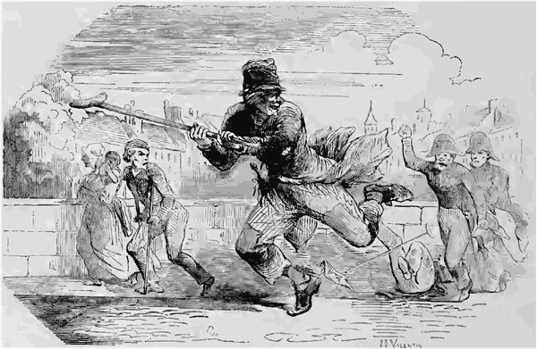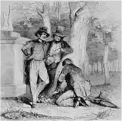 Un naïf Auvergnat, vitrier de profession, était venu à Paris dans l'espoir d'y faire fortune; mais, au bout de quelques mois, il s'aperçut que le nombre de ceux qui courent le même lièvre était beaucoup trop grand dans la capitale pour qu'il lui fût seulement possible de gagner son pain quotidien. Notre homme pensa sagement qu'il ferait mieux de retourner au pays avant d'avoir mangé jusqu'à son dernier sou. Il arrête sa place aux messageries royales, et comme il devait partir le soir même, il se disposa à se promener dans Paris jusqu'à l'heure du départ. Notez qu'il était porteur de toute sa fortune, consistant en une montre, un parapluie et une somme de 150 francs. En sortant des bureaux des messageries, il est accosté dans la rue Notre-Dame-des-Victoires par une espèce d'Anglais qui lui demande le chemin de l'obélisque, et lui promet cinq francs s'il veut l'accompagner. Un Auvergnat ferait cent lieues pour cent sous. Le nôtre trouva l'aubaine bonne, et accepta. On marche, on chemine; ou rencontre bientôt un monsieur qui entre en conversation avec les deux flâneurs. L'Anglais parle de ses richesses; il montre des rouleaux d'or. En traversant le jardin des Tuileries, il exprime le désir d'être conduit à l'exposition du Musée; mais il craint d'être volé dans la foule; il voudrait cacher son or quelque part. L'Auvergnat est prié de creuser un trou au pied d'un arbre; l'Anglais feint d'y enfouir son trésor; puis on s'éloigne, on entre dans un café. Ici, nouvelle crainte de l'Anglais. «Si on m'avait vu enterrer mes rouleaux! dit-il; si quelqu'un allait les exhumer!...» L'Auvergnat offre d'aller bien vite les chercher. «Oui, mais qui me répond de votre fidélité? Laissez-moi du moins quelque garantie.» L'Auvergnat remet aussitôt entre les mains de l'Anglais ses 150 francs, sa montre, son parapluie et sa blouse. Il court aux Tuileries; pas de trésor, le trou est vide.