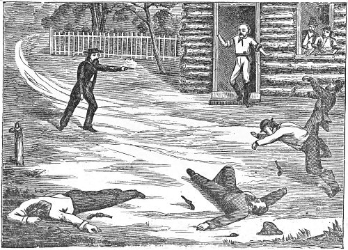 Bill was mounted on an excellent horse, and as he had no difficulty in ascertaining the route taken by the stranger, the ride was a fast and furious one. The pursued and pursuer, after a running ride of thirty miles, came in sight of each other, and a desperate fight was now prepared for. The stranger supposed he had killed Bill and was being pursued by some officer of justice; but Bill was urged on by his excessive hunger for revenge, and it soon came—terrible enough. When about fifty yards apart, Bill discharged his pistol at the stranger, but the ball struck and disabled the horse. There was then an exchange of shots and the stranger lay dead on the ground with a bullet in his brain. Not satisfied with killing the man, Bill stooped over the prostrate body and drawing a bowie-knife from its sheath, he cut a slice out of the stranger’s head which he considered64 would correspond with the wound in his own. This bloody trophy Bill carried with him for years afterwards—a dried piece of flesh and hair.