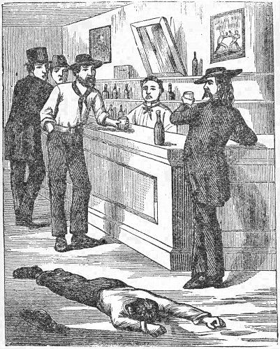 The origin of the difficulty was in bad whisky and ruffian nature. Bill went into a saloon—which was well filled with cattle drivers, who were half drunk and anxious for a fight—and called for a drink without inviting any one to join him. While raising the glass to his mouth one of the ruffians gave him a push in the back which caused him to drop the glass. Without saying a word, Bill turned and struck the rowdy a desperate blow, felling him outside the door. Four of the rowdy’s friends jumped up from their chairs and drew their pistols. Bill appreciated his situation at once, and with wonderful coolness, said: “Gentlemen, let us have some respect for the proprietor. You are anxious for a fight, and I will accommodate you if you will consent to step outside. I will fight all four of you at fifteen paces with pistols.” There was a general consent, and the crowd filed out of the saloon. The distance was stepped off, and the four men stood five feet apart, facing42 Bill. The saloon-keeper was to give the word “fire,” and the arrangements were conducted in as fair a manner as four men can fight one. Bill stood as calmly as though he were in church. Not a flush nor tremor. All parties were to allow their pistols to remain in their belts until the word “fire” was given, when each was then to draw and fire at will, and as often as circumstances permitted. The saloon-keeper asked if all were ready, and receiving an affirmative reply, began to count slowly, pausing at least ten seconds between each count: “one, two, three—fire!” Bill had fired almost before the call had died from the saloon-keeper’s lips. He killed the man on the left, but a shot also struck Bill in the right shoulder, and his right arm fell helpless.