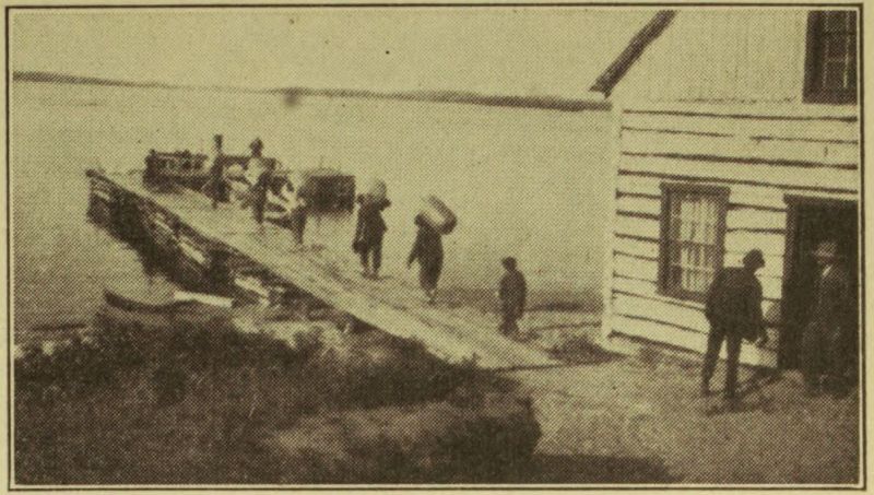 The time of landing was about 2 p.m. Taking a southerly course by their compass, which they had managed to retain, they commenced to walk through the bush, but made little headway owing to the dense mass of foliage, spruce trees, willows and marshy land. They built a fire, cooked one of three carrier pigeons. This was the only food they had had since leaving New York.