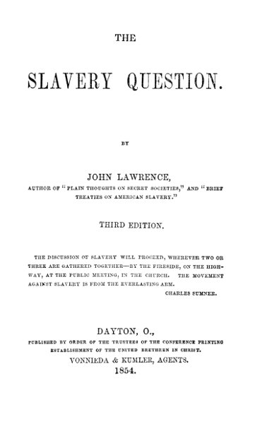 The Project Gutenberg EBook of The Slavery Question, by John Lawrence This eBook is for the use of anyone anywhere in the United States and most other parts of the world at no cost and with almost no restrictions whatsoever. You may copy it, give it away or re-use it under the terms of the Project Gutenberg License included with this eBook or online at www.gutenberg.org. If you are not located in the United States, you'll have to check the laws of the country where you are located before using this ebook. Title: The Slavery Question Author: John Lawrence Release Date: October 5, 2014 [EBook #47050] Language: English Character set encoding: ISO-8859-1 *** START OF THIS PROJECT GUTENBERG EBOOK THE SLAVERY QUESTION *** Produced by deaurider, Paul Clark and the Online Distributed Proofreading Team at http://www.pgdp.net (This file was produced from images generously made available by The Internet Archive)