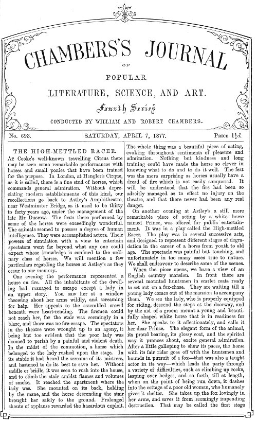 At Cooke's well-known travelling Circus there may be seen some remarkable performances with horses and small ponies that have been trained for the purpose. In London, at Hengler's Cirque, as it is called, there is a fine stud of horses, which commands general admiration. Without depreciating modern establishments of this kind, our recollections go back to Astley's Amphitheatre, near Westminster Bridge, as it used to be thirty to forty years ago, under the management of the late Mr Ducrow. The feats there performed by some of the horses were exceedingly wonderful. The animals seemed to possess a degree of human intelligence. They were accomplished actors. Their powers of simulation with a view to entertain spectators went far beyond what any one could expect whose knowledge is confined to the ordinary class of horses. We will mention a few particulars regarding the horses at Astley's as they occur to our memory.