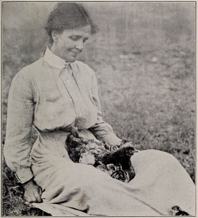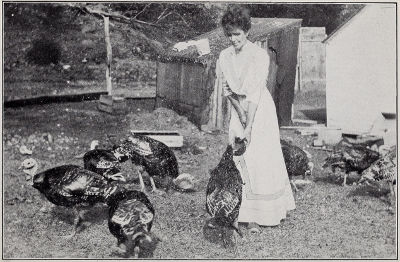 Miss Mahaney was a wonderfully capable trained nurse who broke down at her work and was ordered to the country to save her life, urged particularly to take up some out-of-door work. Poultry keeping appealed to her from the first, but turkeys particularly for the reason of the difficulties to be surmounted. If she could do what others could not she would be satisfied. Anyone could raise chickens, but hardly anyone could raise turkeys. Here was a task that delighted her and a problem that appealed to her. The difficulties she encountered would have discouraged any one but a pioneer of her character. Her deep maternal instinct (and she is, figuratively speaking, mother to everything and everybody upon the beautiful estate where she lives) brought the babies and old turkeys through their blackhead troubles, and from her medical training, together with the aid she received from contact with members of her family who were physicians, she recognized symptoms and remedies which one could acknowledge as miracles and not overstep the truth. She has applied the fruits of her life work to the solving of a problem, and some day the country at large from Maine to California will raise its hat to Margaret Mahaney, the lady from Concord, Mass., who restored what was supposed to be lost:—the art of raising turkeys,—and that in confinement in poultry houses under practically the same conditions as chickens.