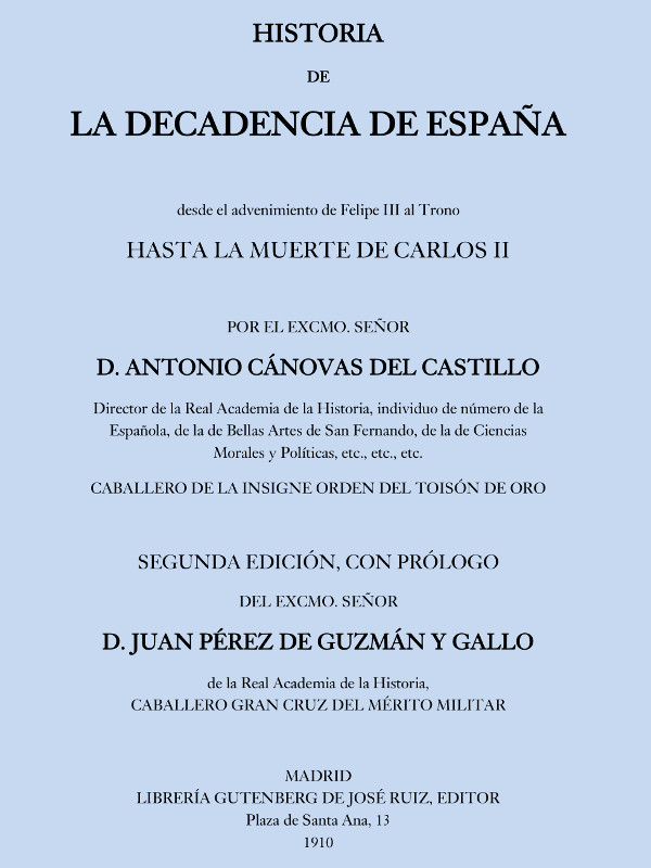 El Sr. Cánovas del Castillo y Vallejo, el editor espléndido y el impulsor de esta obra en honor del que llevó hasta el nombre, que de él recibió en la pila del bautismo, y á quien, más que en los puestos de su abandonada carrera política, le impulsó hacia las gustosas inclinaciones del arte y del trabajo, que hoy constituyen su mayor satisfacción y su orgullo, me decía:—«Mi tío no vinculó la propiedad de ninguna de sus obras literarias á la parca fortuna que disfrutaba. Todas son del público dominio y cualquiera editor lícitamente puede reproducir las que quiera, atendiendo á su legítima especulación, no al honor y al nombre del que las produjo. La Historia de la decadencia de España desde el advenimiento de Felipe III al trono hasta la muerte de Car[ix]los II, fué el primer libro histórico serio que salió de su pluma y entregó á la publicación, cuando el hervor de la sangre juvenil encendía las ideas que después templaron el curso de la vida, la colosal profundidad de sus estudios posteriores y la experiencia personal en los arcanos de los oficios del Estado y de las imposiciones de la vida pública; y aunque ninguna, como ésta, entre sus obras, rebosa aquella frescura de imaginación y de ideas, aquel vigor de concepción y de crítica, aquel desenfado y libertad de expresión con que la Historia de la decadencia está escrita, cuando operada en el yunque de los sucesos y de los estudios la gran evolución de su espíritu, que le condujo á sus puestos eminentes y á sus más grandes producciones literarias, entregó á éstas toda la honrada sinceridad de su alma, ansió recoger é inutilizar los ejemplares de aquella obra ingenua de su juventud, y corregir en parte ó tachar por capítulos enteros el pristino ejemplar que él conservaba. Aun no pareciéndole esto bastante, después de rectificarse á sí propio en aquel Bosquejo histórico de la casa de Austria, que escribió como un avance á la obra fundamental que tenía proyectada sobre todo el brillante período de los dos siglos que sobre el trono que ocuparon con gloria inmarcesible los Reyes Católicos D. Fernando de Aragón y Doña Isabel de Castilla tuvieron asiento los Reyes de la dinastía austriaca; en todos sus trabajos especiales, y más que en ningún otro, en el que tituló Estudios del reinado de Felipe IV, puso total empeño en desautorizar muchas de las ideas, conceptos y juicios vertidos en la Historia de la decadencia, la cual tal vez hubiera quedado enteramente anulada en el largo catálogo de su vasta labor intelectual, si Dios le hubiera concedido vida para llevar á cabo la que tenía dispuesta y preparada con un lujo de documentación y una profusión bibliográfica, que ni antes ningún otro escritor, ni en lo porvenir probablemente ningún otro artífice de nuestra Historia nacional, logrará reunir y organizar, al modo que él la había reunido y organizado en su ya desgraciadamente deshecha Biblioteca. Después de estos avisos del propio autor, una reproducción de la Historia de la decadencia hecha por cualquier editor especulador, sin una nota, sin un prólogo, sin algo que encierre el pensamiento correctivo y la voluntad resuelta que aquel tenía en la profunda rectificación que aquella [x] obra merecía y reclamaba, no podrá ser impedida por nuestra parte y no será, para los que la adquieran y lean, la posesión del juicio histórico de D. Antonio Cánovas del Castillo sobre una época, á la que, por haber sido la más gloriosa y la más crítica de nuestra Historia, él consagró la preferencia de sus estudios en toda la intensidad de que eran capaces sus grandes disposiciones naturales: y los conceptos que de su lectura se formen y los testimonios que de sus textos puedan deducirse, no encarnarán ciertamente ni su pensamiento verdadero, ni su completa veracidad. Ante este temor y esta perspectiva, yo, que tanto le amé en vida y tanto le venero en su recuerdo, quiero adelantarme, quiero reproducir la obra en toda su integridad, como se halla en el ejemplar que él tenía para sí y yo conservo, y quiero que usted me ayude á llevar á la conciencia del lector lo que, en definitiva, su propio autor pensaba de ella, y la preparación que tenía hecha para rectificarla de una manera fundamental.»