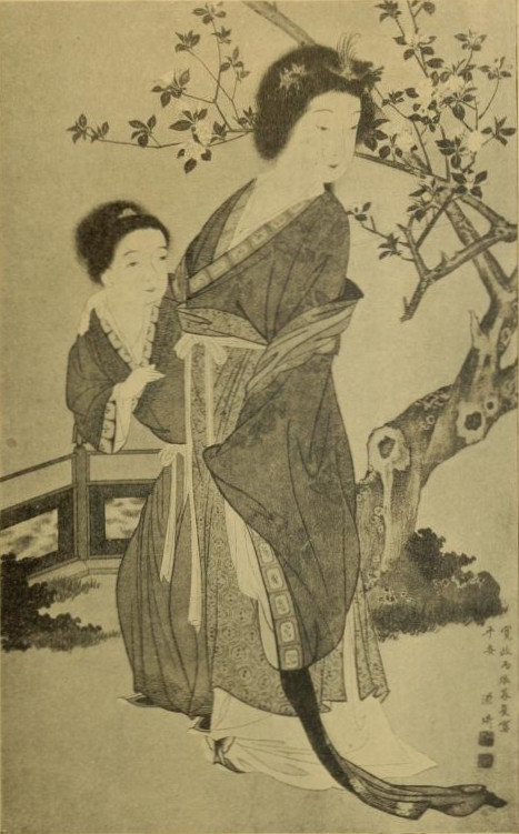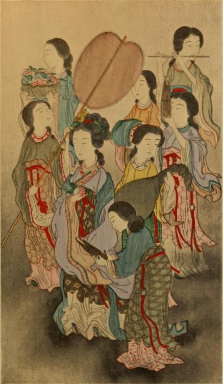 Par toutes les avenues affluaient les visiteurs, venant rendre leurs devoirs à la princesse, les seigneurs à cheval, les femmes nobles dans des chars traînés par des bœufs, ou dans des norimonos. La cour sortait des palais, se réunissait sur les terrasses. Fiaki se hâta de descendre.