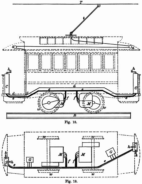 If the successful operation of a street-railway car by mechanical power depended wholly upon the ability to produce a motor of sufficient capacity to do the work, the problem would be an easy one to solve, and would have been solved long before the advent of the electric motor. Mere ability to furnish the necessary power, however, is not enough to meet the requirements. As already shown, the mechanism must be light, strong, compact, simple, and so well protected that it can not be injured except under abnormal conditions. In addition, speed-controlling devices must be provided whereby the velocity may be changed at will and in the shortest possible time, and with as nearly absolute precision as possible. This controlling mechanism must also be so arranged that the direction of motion may be varied with the greatest certainty and as rapidly as may at any time be required. The way in which these409 results are accomplished in an electrically operated car can be understood from Figs. 18 and 19, which are line drawings, in a simplified form, of an ordinary trolley car. Fig. 18 is an elevation showing the outline of the car body and the wheels in broken lines, while the motors and the wires through which the current is conveyed thereto are drawn in solid lines. Fig. 19 is a plan in which the outline of the car floor and the platforms is represented in broken lines, the solid lines being the motors and connecting wires.