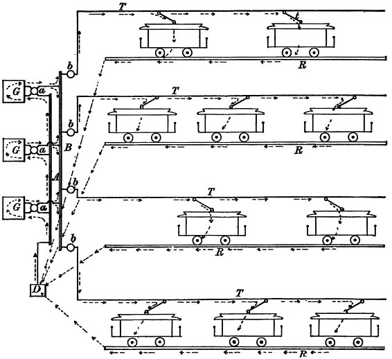 From the trolley wire, through the trolley pole t, to the fixture on top of the car which holds the latter. From this fixture, as shown by the heavy full line, the current passes to a, which is a switch located under the car hood overhanging the platform. From this switch the current passes to a similar one, marked b, located in a like position at the other end of the car. These two switches are called emergency switches; they are provided simply as a safety device, and are used only when the main switches get out of order and the motorman can not turn the current off in the regular way. From the last hood switch b the current passes to411 the bottom of the car, where it enters the wire d d at the point c. This wire d d, as will be seen, runs in both directions, and ends in the stands C C. These latter are the controlling switches, and are provided with a handle h, by means of which the current is turned on or off from the motors, and is directed through them in such a way as to make the car run in whichever direction may be desired. From the controllers C C several wires are run under the car, as shown at e e e. These wires are generally bunched into one or two cables, but they are kept separate from each other by means of strong insulating coverings. Four wires lead into each motor, and three or four into each of the boxes marked G G. If the motors were required to run in one direction only, then two wires would be sufficient to convey the current to them; but as they have to run in either direction, at least three wires are necessary, but in almost every case four are used, as the results obtained thereby are more satisfactory. The boxes G G are called rheostats, and are simply devices through which the current is run so as to reduce the speed of the car, and also for the purpose of graduating the strength of the current that passes through the motors in the act of starting. These rheostats are very seldom in use when the car is in motion, because it is a waste of power to pass the current through them. After the current has passed through the motors it enters the ironwork, and thus gets into the car wheels and finally to the track.