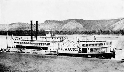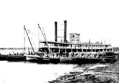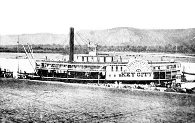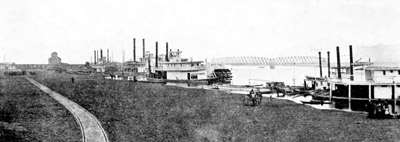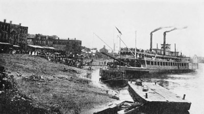 Prescott Levee in 1876. Showing Steamer "Centennial" and the little Hastings ferry, "Plough Boy." The double warehouse, showing five windows in the second story and four in the third, was the building in which the author lived when a boy 32