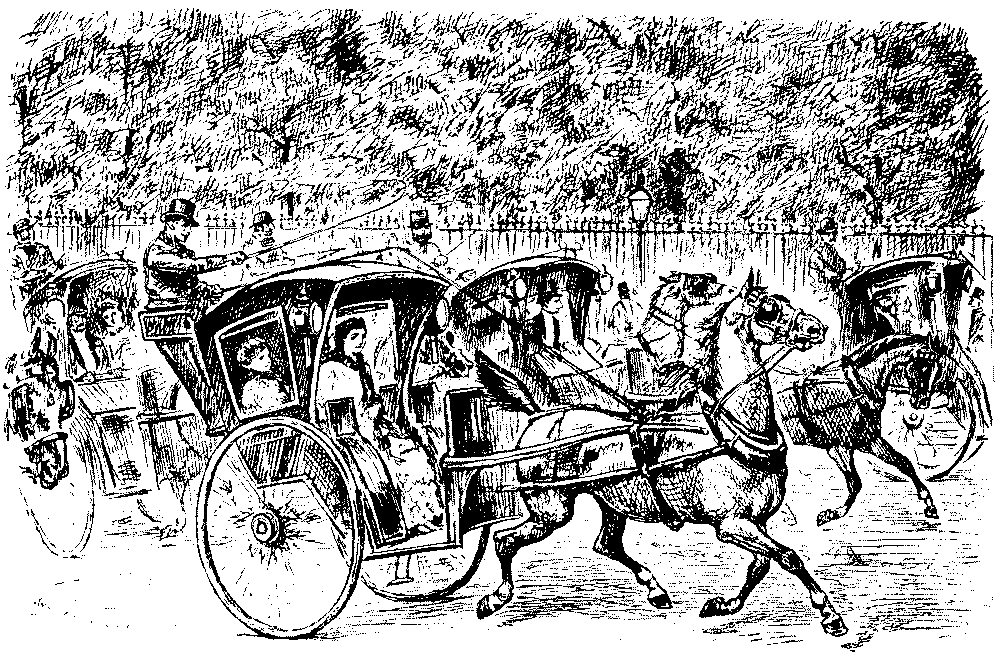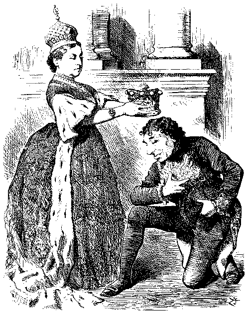 In 1876 the Queen assumed the title of Empress of India; Disraeli went to the Lords as Earl of Beaconsfield, Sir Stafford Northcote succeeding him as Leader of the House of Commons; and the "Bulgarian Atrocities" proved the first phase in the conflict which made the Balkans the cockpit of Europe for over forty years. Punch did not cavil at Disraeli's earldom, though he thought his refusal of the Garter in 1878 well calculated rather than modest. He suggests, moreover, that Earl of Coningsby would have been a better title; and in the cartoon headed, "Empress and Earl, or One Good Turn deserves Another," shows Dizzy kneeling to the Queen and saying, "Thank your Majesty! I might have had it before! Now I think I have earned it!" More sympathetic are the verses in which Punch describes the realization of Disraeli's triple dream of success in Fashion, Letters and Politics—the dream that inspired him when he was only an articled clerk and a Jew boy:—