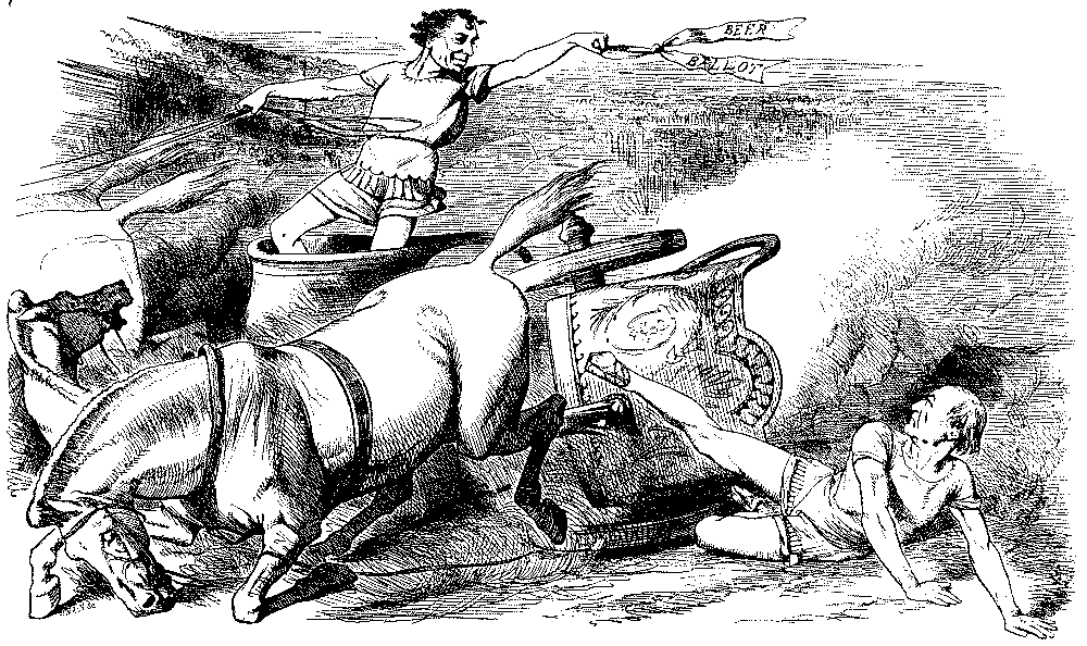 But if in Europe Great Britain never got beyond the stage of naval demonstrations and the summoning of troops from India, these eighteen years were not devoid of great as well as spectacular events. They opened with the triumphant return to power of Disraeli, admirably symbolized in Tenniel's great cartoon of the chariot driver and his fallen rival, and with his efforts to translate into practical politics his grandiose doctrines of Imperialism. He made the Queen Empress of India, he riveted our hold on the Suez Canal by the opportune purchase of the Khedive's shares in 1875; he claimed to have brought back "Peace with Honour" from the Berlin Congress of 1878, the year which marked the zenith of his power and the beginning of its decline. The twelve years that followed Gladstone's[Pg 6] success at the polls in 1880 were crowded with momentous events; the rise and ferment of the new nationalities abroad; the advent of new champions and gladiators in the political arena at home—Parnell and Randolph Churchill and Chamberlain. In the sphere of domestic politics Ireland dominated the scene. Parliamentary obstruction was raised to a high art; the activities of the physical force extremists culminated in the tragedy of the Phœnix Park murders, and the history of the next few years is written in the two words Coercion and Conciliation, which split the Liberal Party, brought back the Conservatives to power in 1886, and under the Balfourian régime restored a certain measure of peace and prosperity to Ireland. Lord Beaconsfield's "spirited foreign policy" had been largely reversed under Gladstone, and the results did not nourish our national pride. The handling of our frontier troubles in India had at least the support of some of the wisest Anglo-Indian experts, but our magnanimity to the Boers after Majuba was not merely open to the charge of craven-spiritedness, it paved the way to further troubles. It has been said that "any fool can annex"; but it needs a wise man to know when to grant autonomy. Moreover, the loyalty of Gladstone's supporters—including Punch—was strained to the uttermost by the disastrous failure of the attempt to relieve Gordon at Khartoum. The full knowledge now available makes it clear that Gordon's appointment was a risky experiment—that his judgment was not equal to his nobility of character—but the months and months of procrastination and vacillation, and the inadequacy of the relieving force when dispatched, cannot be explained away. It was just one of those situations which warranted the old gibe against Gladstone's "three courses." There were moments, and this was one of the most searching, in which he was mentally incapable of "seeing his duty, a dead sure thing" and going for it "there and then" in the way in which plain men with plain minds would have done.
