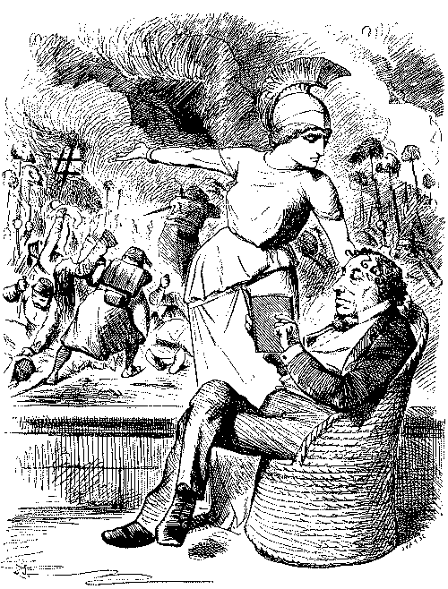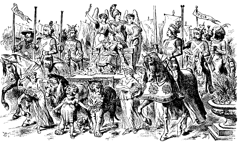 The intervention of amateur diplomatists, clerical or professorial, however well-meant, was firmly and impolitely discouraged when Turkey and Russia were at death grips at Plevna. Early in 1878 Punch endeavoured to turn such efforts into ridicule, as instances of "self-election of the unfittest." Still the naval demonstration in Besika Bay found Punch in his most pacific mood, applauding Lord Carnarvon, who with Lord Derby had resigned, and condemning Lord Beaconsfield's dangerous action and unconvincing explanations. The calling out of the Reserves still further increased Punch's anxiety, and inspired a "Proclamation" calling for self-restraint. When it was announced that Carlyle had joined Bright and the Duke of Westminster in signing a petition against war, Punch noted that the old sage of Chelsea was anything but a lover of peace at any price. But the incident which perturbed him and other critics of the Government more than anything else was the bringing of a contingent of Indian troops to Europe. Punch[Pg 17] vigorously supported Gladstone, who held the action of the Government to be not merely provocative but unconstitutional. When the troops were re-shipped to India, he published a sarcastic inscription, to be engraved on a monument on Primrose Hill commemorating an exploit which had cost £750,000. It seems a little sum to us with our profligate habit of thinking in millions, but the frugal taxpayer of the 'seventies, as represented by Punch, thought it a monstrous extravagance. The inscription is too long to quote in its entirety, but we may give the peroration:—