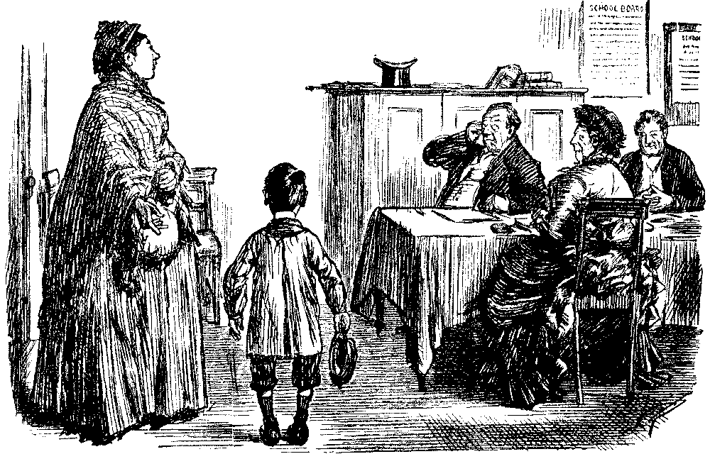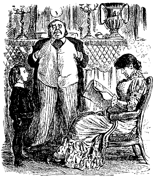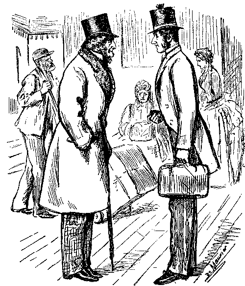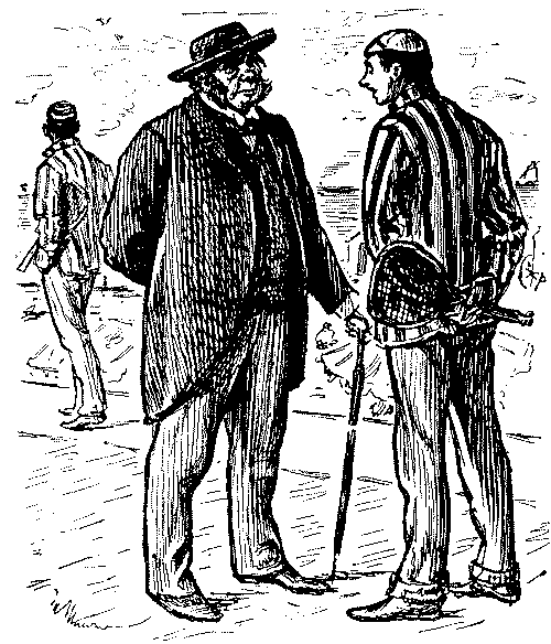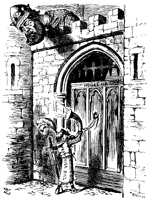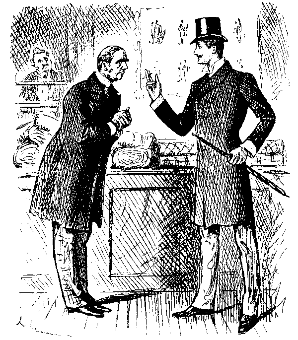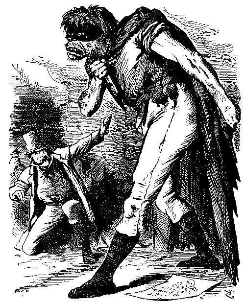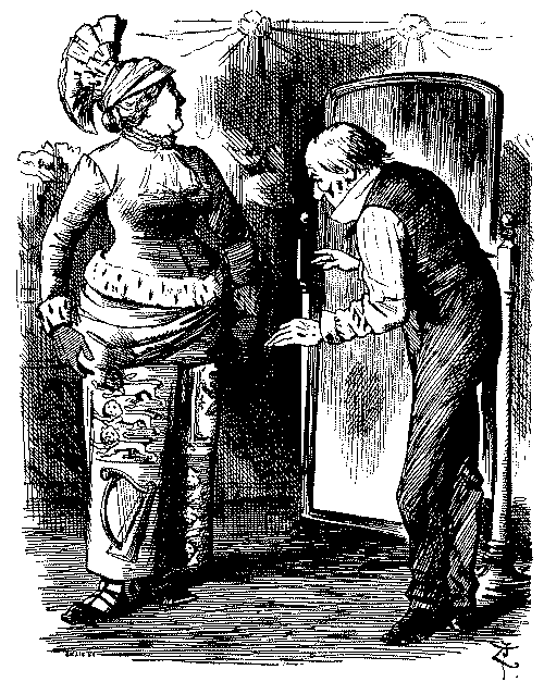 Punch, always concerned with the dignity of the Mother of Parliaments, was from the very outset exasperated by the increasing levity and obstructiveness of the new House. The levity he satirized in a series of burlesque entertainments with Mr. Whalley as call-boy and Dr. Kenealy as gasman. Dr. Kenealy's efforts to re-open the Tichborne case ended in absurdity—his motion being supported by only two members, Mr. Whalley and Major O'Gorman, that gigantic playboy of the West.[2] Obstruction, another and far more serious matter, was soon organized into a science, and led to repeated scenes of which more anon. Of the new Ministers, Mr. Ward Hunt, the First Lord, was especially singled out for attack because of his cavalier treatment of the loss of the Vanguard and the Admiralty's Fugitive Slave Circulars. A propos of the former, Punch represented Neptune warning Britannia that there would be a row if she did not rule the waves properly. The Fugitive Slave question led to protracted debates and much hostile criticism. In October, 1875, a cartoon shows a slave[Pg 10] crawling on board a British warship and clinging to the flagstaff, while Ward Hunt, popping up from the companion, observes: "A runaway slave, John. You'll have to give him up, you know! See our Circular of July 31." John Bull retorts: "Give 'im up, yer Honour!! As well order me to haul down that there flag at once!!!" A fortnight later Ward Hunt is made to reply to his friend Punch:—