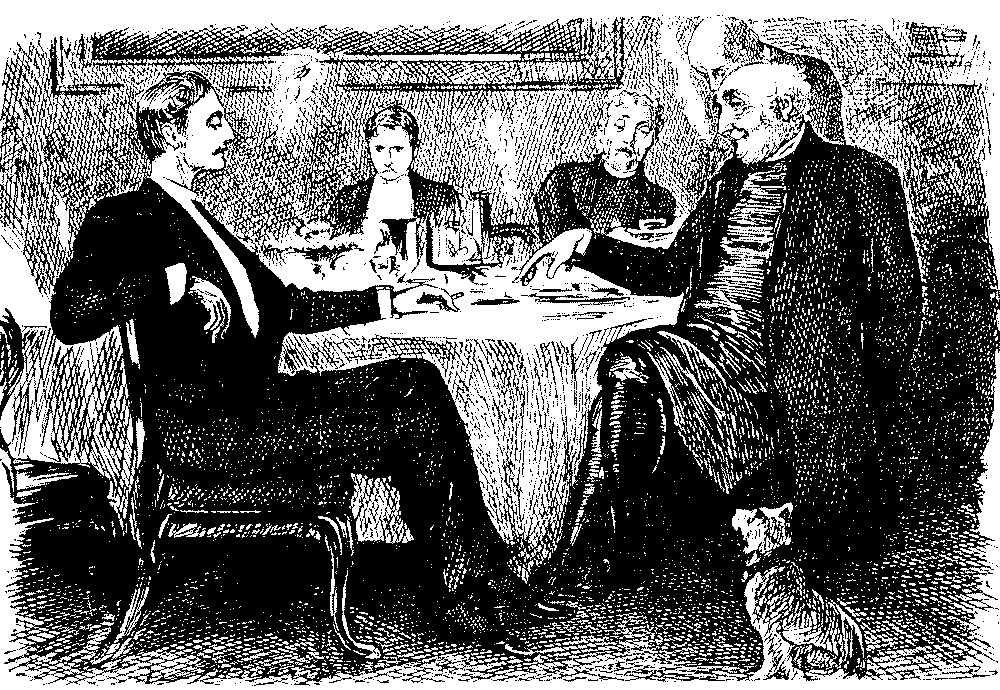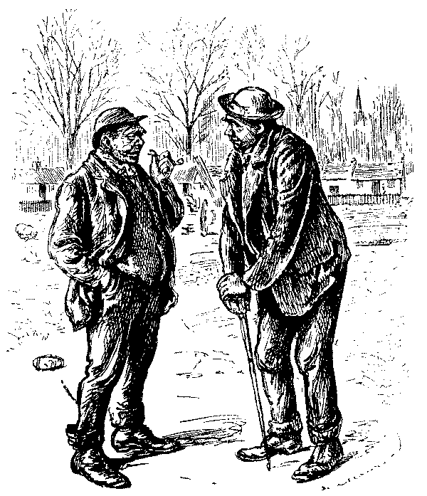 Mr. Gladstone was now employing his leisure by felling trees at Hawarden, and the contrast lent point to one of Tenniel's happiest cartoons—that of "The Earl and the Woodman"; Disraeli, in his earl's robes and coronet, contemplates Gladstone arrayed à la Watteau, and observes with emotion: "How happy is this blithe peasant, whilst I, alas!—" (Dissembles.) Punch, however, was becoming more sceptical of the genuineness of Gladstone's desire for retirement, and in a parody of "You are old, Father William," scouts the notion of his prematurely posing as a Nestor.