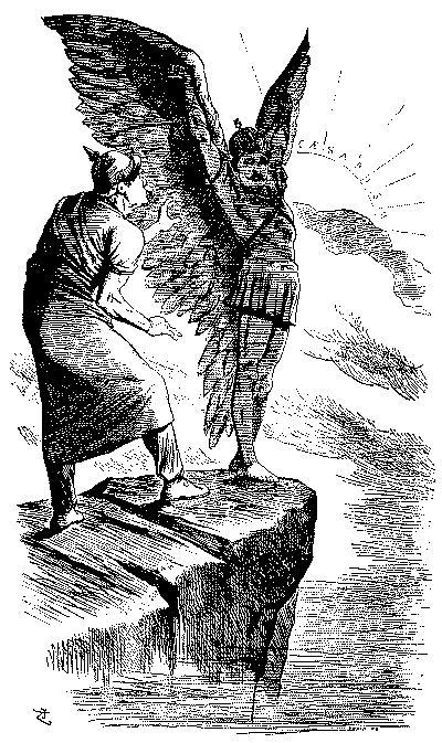 By way of filling in this rough outline with more detail, we may note that Gladstone's resignation of the Liberal leadership at the close of 1874 was regarded by Punch as premature. In one of the first cartoons in the next year Dizzy is shown saying good-bye to his great antagonist: "Sorry to lose you! I began with books; you're ending with them. Perhaps you're the wiser of the two." Perhaps he would have been—in the ultimate verdict of posterity—had his decision been final. But Punch was right in regarding Gladstone as an unspent force, and in his regretful and affectionate farewell clearly indicates a hope of his return:—