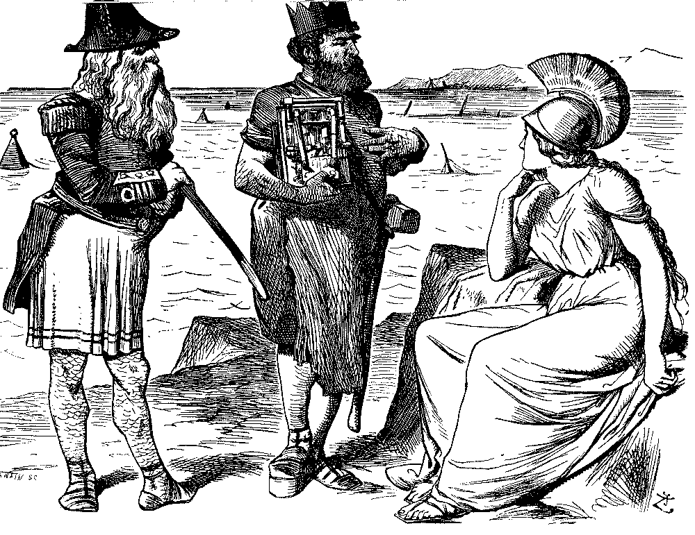 Punch's view, expressed in comments on the debate in the following February, was that the matter should be left in the discretion of captains—as it had been for thirty-six years. He declared, not without reason, that both circulars were virtually dead, and that the country would not stand them. Meanwhile the growth of the German Navy, which in his earlier years Punch had persistently ridiculed and belittled, had begun to excite attention and misgiving; Punch, though a Liberal, was a "big Navy" man, and, early in 1875, was concerned with the dangers of our falling behind in the race of naval armaments:—