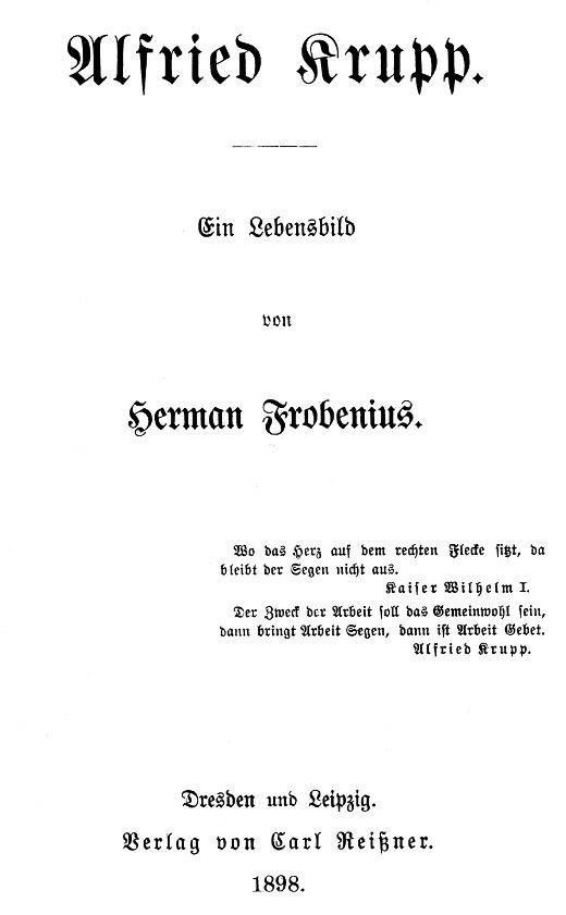 Ein vierzehnjähriger Knabe stand Alfried am Grabe seines Vaters, und in den tiefen Schmerz hinein, welcher sein Herz mit Thränen erfüllte, in die bangen, schweren Gedanken, welche mit ungewohnter Last sein Haupt beschwerten, klangen anstatt der Töne warmen Mitgefühls die Aeußerungen des frostigen Mitleids wie ein schneidender Mißton, seinem thränenverschleierten Blick entging nicht das Achselzucken der klugen Leute, welche es nicht für der Mühe werth hielten, ihre Schadenfreude zu verbergen. Und die Thränen versiegten in heiligem Zorn, das schmerzgebeugte Haupt erhob sich in stolzem Bewußtsein der großen Aufgabe, welche der Knabe von heute ab als Nachfolger seines Vaters diesen kleinen Seelen gegenüber zu vertheidigen, in ihrer ganzen vollberechtigten Bedeutung zur Anerkennung zu bringen berufen war. So verließ Alfried Krupp das frische Grab seines Vaters, nicht in verzweifelndem Kleinmuth des Kindes, sondern im muthigen Selbstvertrauen des werdenden Mannes, so ward er, der vierzehnjährige Knabe, der Chef der Firma Friedrich Krupp, durch das im Tiefsten ihn verletzende Gebahren seiner Mitbürger am Grabe des Vaters, zu dem Manne der eisernen Energie, des rücksichtslosen Zielbewußtseins, des tiefsten Verständnisses[S. 18] für die Lebensnoth seiner Mitmenschen, wie er in seinem ganzen Leben sich bewiesen hat.