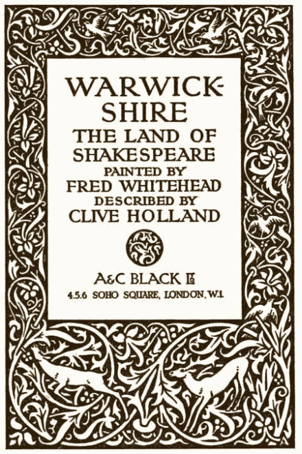 To those who know Warwickshire well it will be unnecessary to either sing its praises, as not only one of the most historic but also one of the most fascinating of middle–England shires, or to urge its claims for the consideration of those who love the fair, open country, winding roads, and pleasant hills and vales. This county, of whose beauty poets from almost time immemorial have sung, possesses an added interest beyond the romantic elements afforded by its history, its magnificent survivals of bygone ages in castles, manor–houses, churches, and other domestic buildings, in that it is the land of Shakespeare. Around this beautiful district of England still hangs some of the unfading glamour which comes from the association with it of great deeds and great names; from amongst the latter of which that of “the nation’s poet” stands out with undimmed lustre as the centuries pass away.