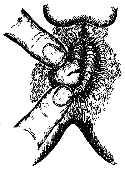 The first step in the operation is to dilate the sphincter muscles, which is to be done in a slow but steady manner by introducing the thumbs into the rectum, back to back, and making gradual pressure around the anal orifice until muscular contraction is overcome.
