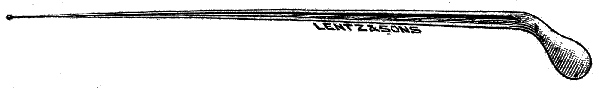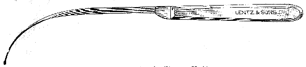 If the internal opening is more than an inch from the anus, a probe-pointed bistoury (Figs. 28, 30, p. 61) should be introduced into the fistula upon a director, and its point made to impinge upon a finger in the rectum. As the finger and the instrument are withdrawn, the necessary incision is made. Or the director can be passed through the sinus, and a wooden gorget (Fig. 35) inserted into the bowel, after which the track can be divided with an ordinary bistoury. The gorget prevents the opposite side of the bowel from being injured should the knife slip. (Fig. 36).