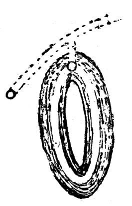 The method of employing this ligature is as follows. A solid cord of india-rubber, about one-tenth of an inch in diameter, may be threaded to a probe having at one end a rounded opening, or eye, through which the ligature is passed. The probe enters the fistula from the external to the internal opening, and passes out through the anus. To facilitate the passage of the cord, the rubber should be put on the stretch. After the ligature is passed, a soft metallic ring is slipped over the two ends of the cord; the cord is then tightly stretched and the ring slipped up as high as possible and clamped.