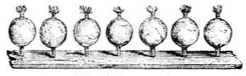 This bird case is likewise a calendar for the Arikkaras, for they reckon the seven cold months by the seven schischikués, beginning to count by the middle one for the coldest month. On the left hand they reckon three months till the warm weather, which lasts five months, and which they pass over, to begin at the end of the schischikués with the other cold months, proceeding to the centre where the greatest degree of cold recurs. Leaving out the five months of warm weather, May, June, July, August, and September, those which are reckoned by the schischikués are—