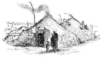 {203} On the 30th of June, at noon, a band of Indians had arrived, and twenty-five tents were set up near the fort. The women, who were short, and mostly stout, with faces painted red, soon finished this work, and dug up with their instruments the clods of turf, which they lay round the lower part of the hut. One of these tents, the dwelling of a chief, was distinguished from the rest. It was painted of the colour of yellow ochre, had a broad reddish-brown border below, and on each of its sides a large black bear was painted (something of a caricature it must be confessed), to the head of which, just above the nose, a piece of red cloth, that fluttered in the wind, was fastened, doubtless a medicine.[8] We [Pg 20]now saw the Indian women returning in all directions from the forest, panting under the weight of large bundles of wood, which were fastened on their backs. Their dogs lay about the tents; they were large, quite like wolves, and of different colours, chiefly of the colour of the wild grey wolf, and some spotted black and white. Reduced to skeletons by want of food, they could not stretch out their sharp backbone; but, for the most part, went crooked and contracted, looked about for old bones, and growled at each other, showing their white teeth. They were not so savage to strangers as the dogs of the Crows, at Fort Clarke, and if one of them seemed inclined to bite us, he was immediately very roughly kicked and beaten by the Indians.