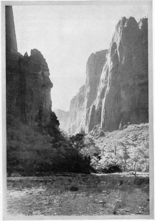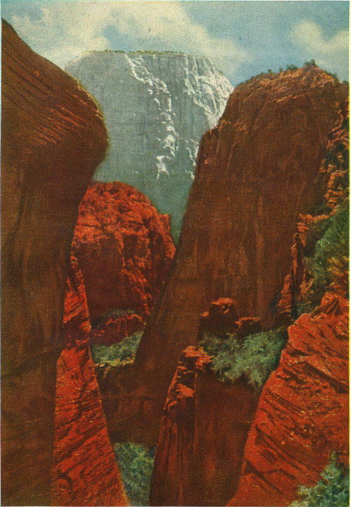 Zion Canyon is a profound gorge with the colors of blood, fire and snow, a matchless carving by the greatest of all sculptors, erosion. Several of its mighty rock temples rank with the most majestic masses in the land. The variety of its endless etchings, the exquisite harmonies of its painted precipices, the sustained grandeur of its stupendous buttes and walls, its glorious cycle of color from dawn to sunset are sources of undimmed delight to the artistic instinct within everyone. It has one aspect of beauty from its green-garbed floor, another from its dizzy rim of white; from the dusky depths of the Narrows the dominant sensation is soul-gripping awe.