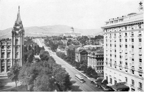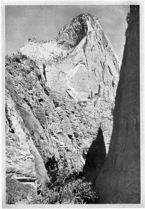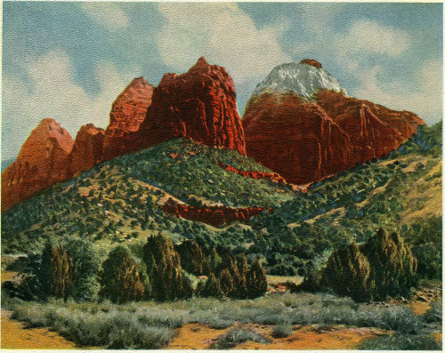 In an instant the scene changes completely. Long, buttressed and fretted mesa promontories parade solemnly into view, an endless array of marching mountains banded with buff, red, pink and gray, mountains that seem to have come from nowhere. Soon arises across the gray-green sage the huge rock cathedral called Smithsonian Butte, spired with silver and gray; and then, instantaneously dominating the entire landscape, there appears, at the gates of Zion, the West Temple of the Virgin. The transcendent beauty of this tremendous tinted temple of stone is best realized when irradiated by the morning or afternoon sun. The southern facade of the structure forms a sundial for the villages near by. The finest description is that of Captain C. E. Dutton, a celebrated geologist who, while in the service of the government, wrote in 1880: