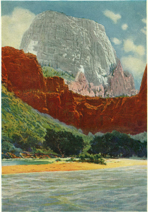 Mormon colonists entered the region about 1858, began its patient reclamation by irrigation, and named the marvelous canyon Little Zion. Major Powell, the famous explorer-geologist reconnoitered the country in 1870. A few years later Captain Dutton studied it and in “The Tertiary History of the Grand Canyon District,” now out of print, presented a picture that is “a classic of inspired description.” From that time until 1909, except for the visits of a few artists and travelers of the adventurous type, Zion was practically unknown. It may now be visited in perfect comfort. Several colleges have sent classes there for summer study.