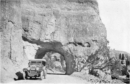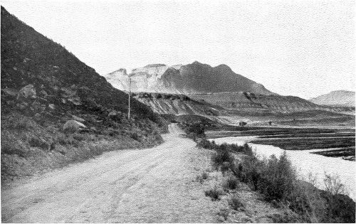 The road now follows Ash Creek, a tributary of the Virgin, over lava flows where prickly pears, pin-cushion cacti, yucca, torchweed and miner’s candlesticks grow among the sage brush. Thereabouts the first view is had of the Valley of the Virgin, Utah’s “Dixie,” a tumbled region of low mesas, black volcanic cones, lava fields and dunes of cherry-red sand, settled by Mormon colonists in 1858. This “Dixie” section of Utah, about 3,000 feet in elevation, is sub-tropical in climate, grows a large variety of agricultural products including cotton and tobacco, and its poplar-shaded villages have a quaintness suggestive of foreign lands. One of the most picturesque communities is Toquerville, named after an Indian chief, and where the automobiles stop so that the traveler may purchase for small sums an amazing variety of delicious fruit: figs, pomegranates, grapes, melons, almonds, peaches, pears, plums and apricots. Along the village street, with its double row of poplars planted as windbreaks, are odd houses of adobe fenced with stone, seemingly asleep beneath their luxuriant fig trees; irrigation streams gurgle and sing with the cool seduction of flowing water in an arid land. The scene has a pastoral air of Biblical peace and plenty. Three miles south, the Harding Highway crosses La Verkin Creek, turns eastward, and begins to climb.