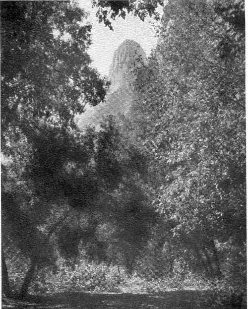 “Directly in front of us a complex group of white towers, springing from a central pile, mounts upward to the clouds. Out of their midst, and high over all, rises a dome-like mass which dominates the entire landscape. It is almost pure white, with brilliant streaks of carmine descending its vertical walls. At the summit it is truncated and a flat tablet is laid upon the top, showing its edge of deep red. It is impossible to liken this object to any familiar shape, for it resembles none. Yet its shape is far from being indefinite; on the contrary it has definiteness and individuality which extort an exclamation of surprise when first beheld. Call it a dome; not because it has the ordinary shape of such a structure but because it performs the functions of a dome.