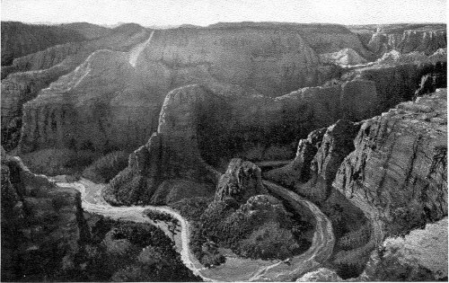 Southward from the thirty-eighth parallel of latitude the surface of Western Utah descends in magnificent “Cyclopean steps” from the flattened summits of the Wasatch Mountains, 11,000 feet high, to 3,000 feet at the Rio Virgen, then ascends gently in Arizona to the colossal arch of the Kaibab Plateau, 9,000 feet in elevation and overlooking the Grand Canyon. These Titanic terraces and palisaded plateaus, more particularly the flaming canyons and jeweled amphitheatres cut from their color-saturated rock layers, form scenic spectacles without peer or rival on the globe. Nothing else is comparable to these wonderlands. To see them is both a thrilling adventure and an artistic delight.