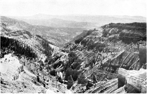 From Cedar Breaks, cut into mountains 11,000 feet high, the vision has a sweep of 100 miles, and the vast terraces may be seen thrust out to the south like promontories into the sea. Where one succeeds another, the uppermost presents sinuous cliff walls, hundreds of miles in length and superbly distinctive in color and carving. More than 10,000 feet of strata are exposed, “a library of the ages in vivid bindings” that contains the fossil remains of creatures since the morning of life on earth. Each step down indicates the removal, by streams, rain, frost and wind, of all the rock-layers above it. From the Grand Canyon Platform, these 10,000 feet of strata have been completely swept away.[1]