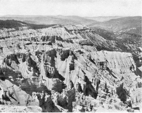 The highest of the Terraced Plateaus, the Markagunt and Paunsaugunt, in which Cedar Breaks and Bryce Canyon lie, break down in spired palisades of the Pink Cliffs, endless in sculptured variety. Beneath the Markagunt the southern scarps of the Kolob Plateau, into which flaming Zion Canyon is sunk, form noble cliffs of pure, reposeful white. The next step downward displays the glowing Vermilion Cliffs, castellated with ornate prodigality and perhaps the grandest of all. Lower still are the Shinarump Cliffs, banded with reds, 7 browns, yellows, greens and purples. Between them and the Kaibab lies a stretch of desert like a flattened rainbow. Such is the strange, magnificent and colorful structure of the land.