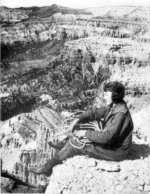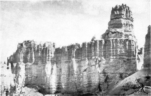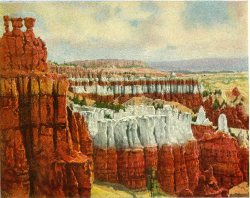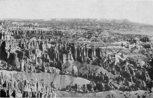 Bryce Canyon also is an amphitheatre, a richer, more compacted bit of resplendence. You hardly believe that Bryce Canyon exists until you have gazed many times; so amazing is its beauty that it seems like the flashing vision of a dream. It is something heretofore unknown and unsuspected in scenery—a miracle of erosion, a peerless fantasy of color. From its depths, in pairs, in groups, in clusters, in hosts and in myriads, leap to the eyes the most amazingly bizarre forms, slender, dainty, bulky, grotesque—a bewildering combination of heaven and hell in which the angelic easily predominates. These myriad forms, human, animal and geometrical, lighted with unearthly radiance, seem to dance from their celestial castles and gorgeous grottoes to meet the beholder. Bryce contains all that architecture, all that sculpture 8 knows, in one great glory hole painted pink, red, white, orange and purple.