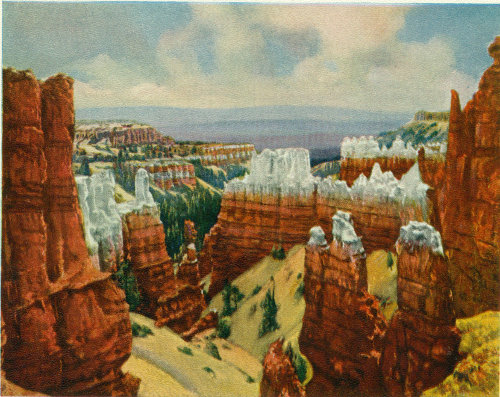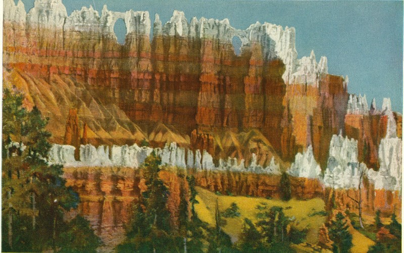 Cedar Breaks, the highest of Utah’s jeweled amphitheatres, is a place of wild and lofty beauty, a series of vast sculptured basins sunk into the summits of the mountains. Endless outflung bastions and buttresses, supporting towers, parapets and craggy spires, parade from the rim down into the painted abyss where, dotted by the green of pines, red, orange, yellow, purple and white are banded and splashed in a symphony of color literally unbelievable till the eyes confirm.